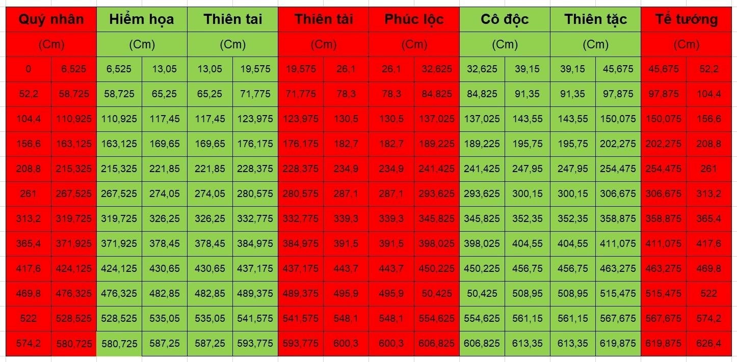 Trong đó, thước này lại được chia nhỏ thành 8 cung tương ứng với những thông số khác nhau, gồm 4 cung tốt với ký hiệu màu đỏ và 4 cung xấu với ký hiệu màu đen. Khi tính toán kích thước cửa nhựa toilet theo chuẩn phong thủy, kiến trúc sư sẽ tránh đi những cung xấu và chọn trong dải cung tốt, tức là chọn đỏ, tránh đen. Để dễ dàng hình dung hơn, quý khách hãy tham khảo bảng tra cứu thước lỗ ban ở hình trên để xác định kích thước đúng.