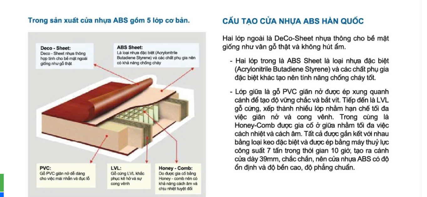 Cửa nhựa ABS Hàn Quốc có cấu tạo giống như các loại cửa thông thường với các lớp khác nhau. Có 2 lớp DeCo để trang trí; được làm bằng chất liệu từ nhựa thông giúp bề mặt giống như vân gỗ thật. Hai lớp ở trong là nhựa ABS nguyên sinh độ nhẵn mịn, cứng chắc cao. Ở phần dọc cánh cửa chính là lớp nhựa gỗ PVC để bắt khóa cho cửa cũng như tạo nên độ vững chắc. Phần tiếp theo chính là lớp gỗ cứng LVL giúp tạo độ cứng và chống cong vênh cho cửa. Lớp ở trong cùng là lõi tổ ong là Honeycomb có tác dụng cách âm, cách nhiệt hiệu quả. Các lớp ở cửa được gắn với nhau bằng loại keo đặc biệt sau đó cửa được ép bằng máy thủy lực tạo ra cánh cửa dày 35mm vượt trội. Có thể thấy rằng cấu tạo của cửa nhựa ABS hàn Quốc nhiều lớp cho thấy cửa rất bền và chắc chắn.